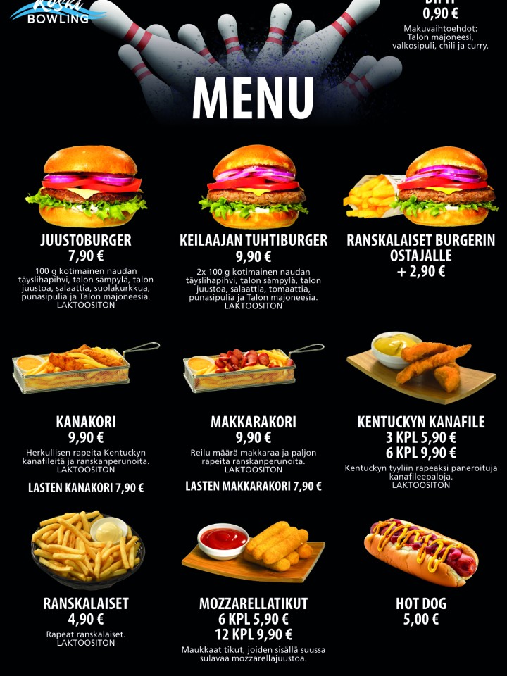 Tarjoamme ruokailuja tilauksesta myös isommille ryhmille, kysy lisää keilahallilta tai info@koskibowling.fi.